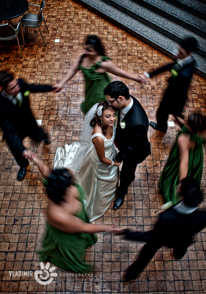 Ask the bride to spin around in her lovely dress and take a few pictures using a slow shutter speed. Also you can use all bridal party spinning around.